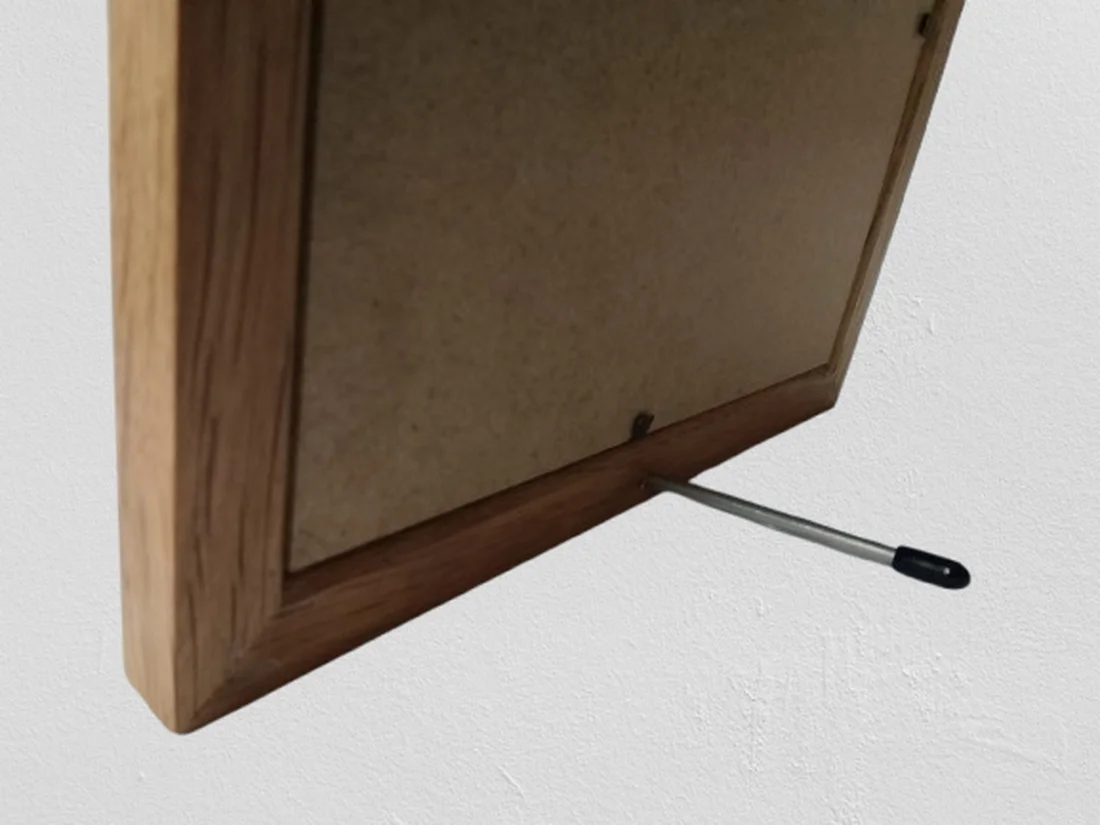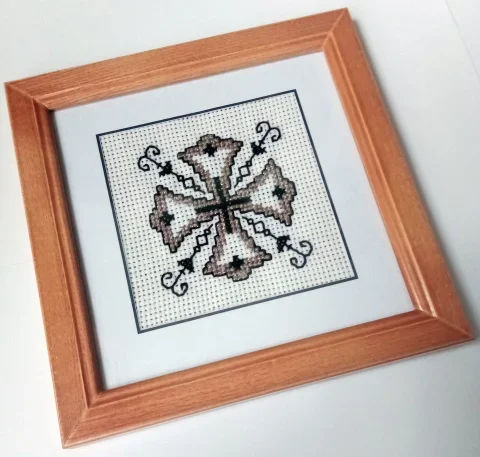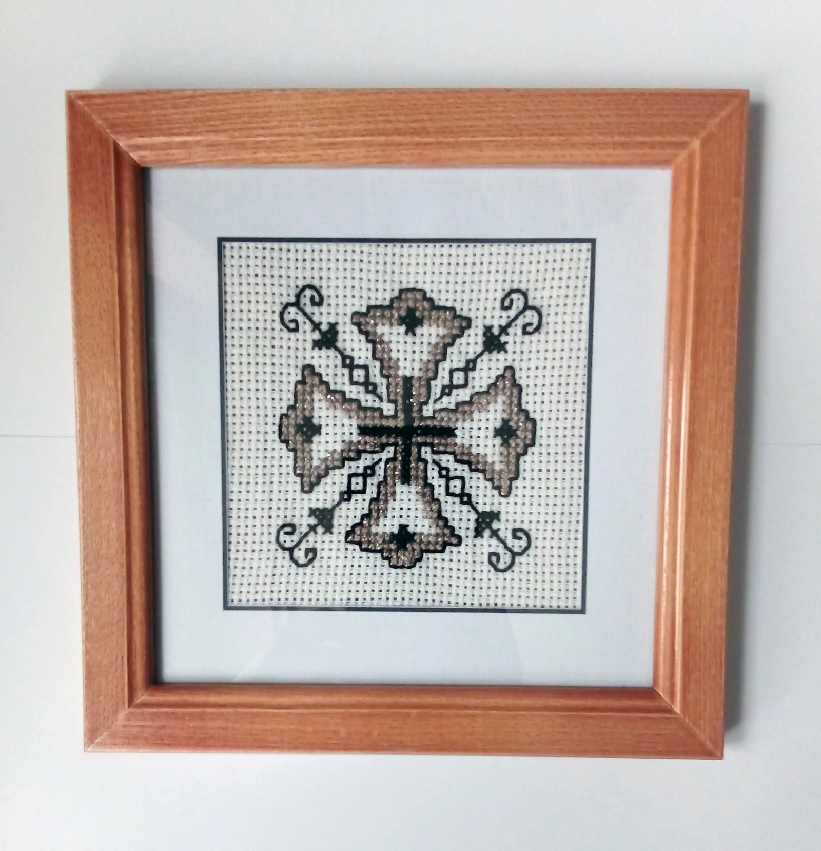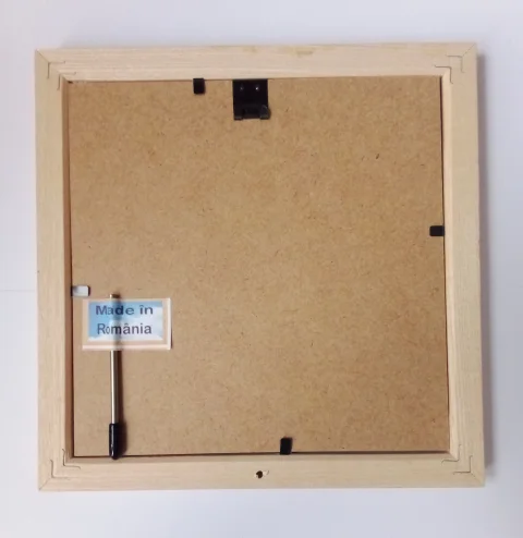 Blazon realizat manual pe etamină cu fire speciale (inserții metalizate), înrămat cu lemn natural lăcuit și sticlă, suport de perete și picioruș de sprijin pentru birou. Dimensiuni: 18 x 18 cm.