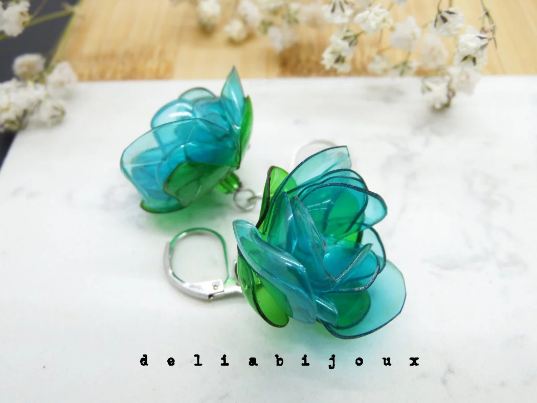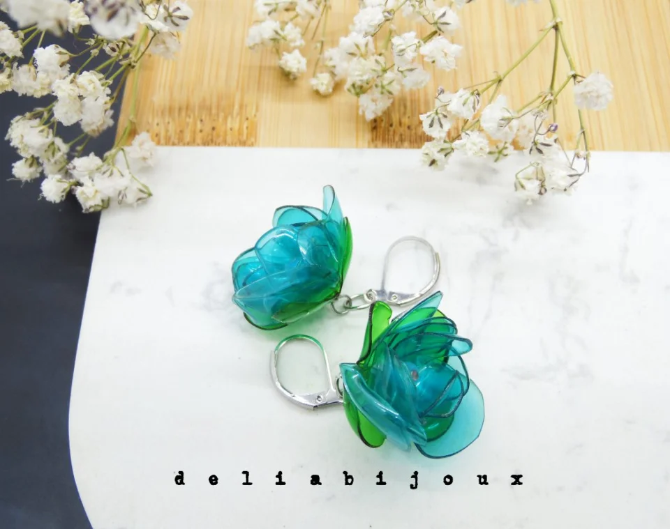 Ace?ti cercei unici sunt crea?i din sticle de plastic reciclate, modelate cu grij? ?n forme delicate de flori. Fiecare petal?, realizat? ?n nuan?e translucide de bleu ?i verde, capteaz? lumina cu un efect subtil de str?lucire, ad?ug?nd un aer proasp?t ?i vibrant accesoriilor. Cerceii sunt u?ori ?i confortabili, ideali pentru a ad?uga o not? sustenabil? ?i creativ? oric?rei ?inute.