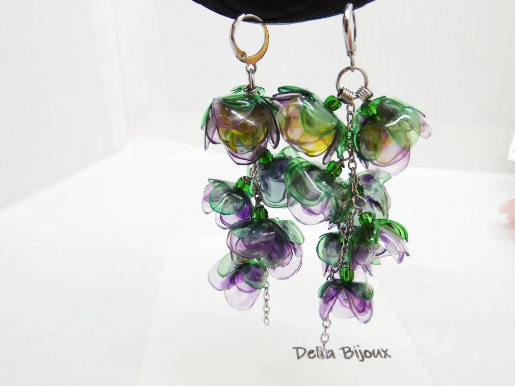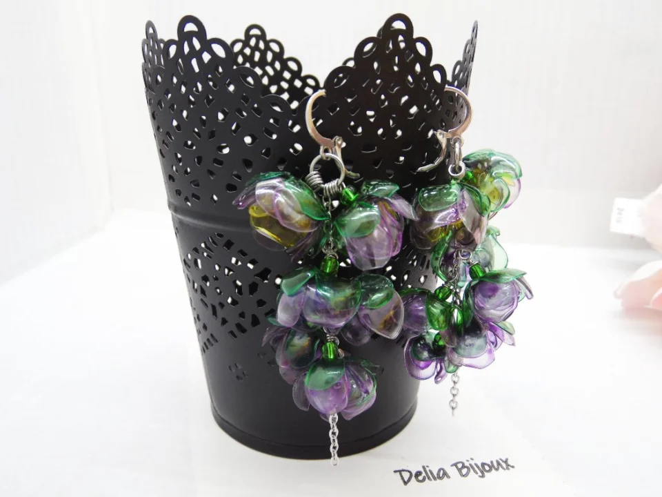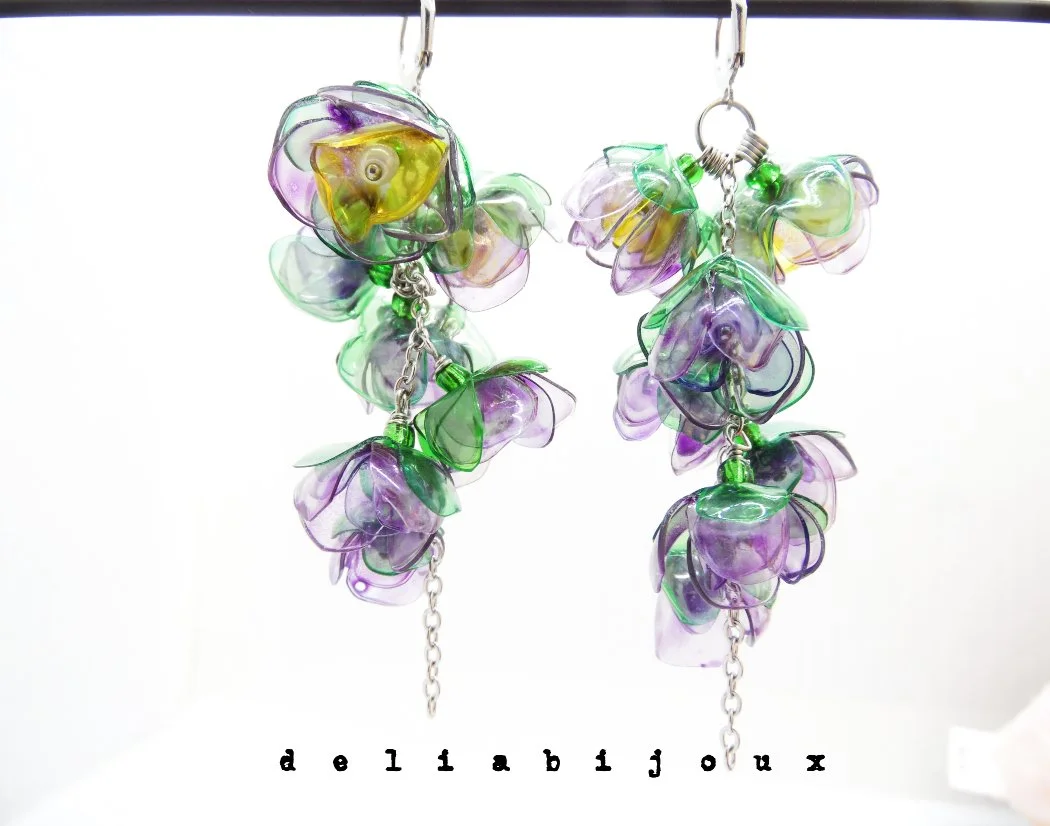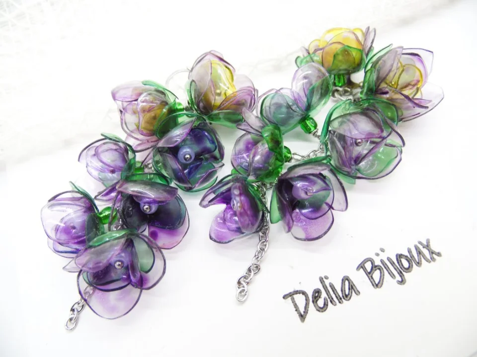 Ace?ti cercei spectaculo?i cu flori realizate din sticle de plastic reciclate sunt o alegere perfect? pentru iubitoarele de accesorii originale, sustenabile ?i u?oare. Fiecare floare este decupat? manual, modelat? la c?ldur? ?i pictat? ?n nuan?e de mov-lila, cu accente calde de galben ?n centrul florilor mai mari, oferind un efect artistic deosebit, cu un aer misterios ?i elegant. Frunzele verzi completeaz? compozi?ia, aduc?nd un aer proasp?t ?i natural.