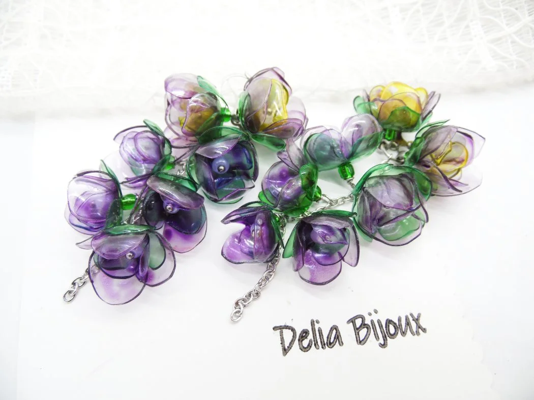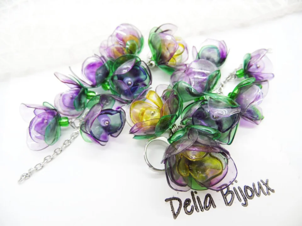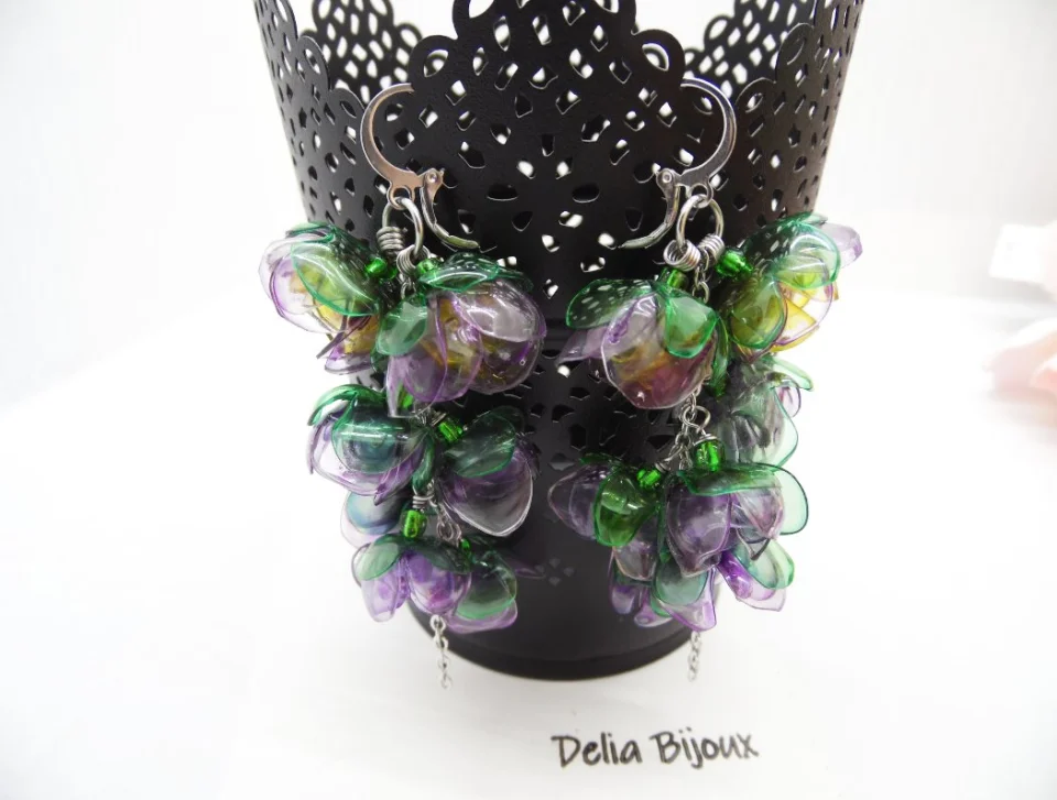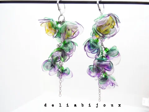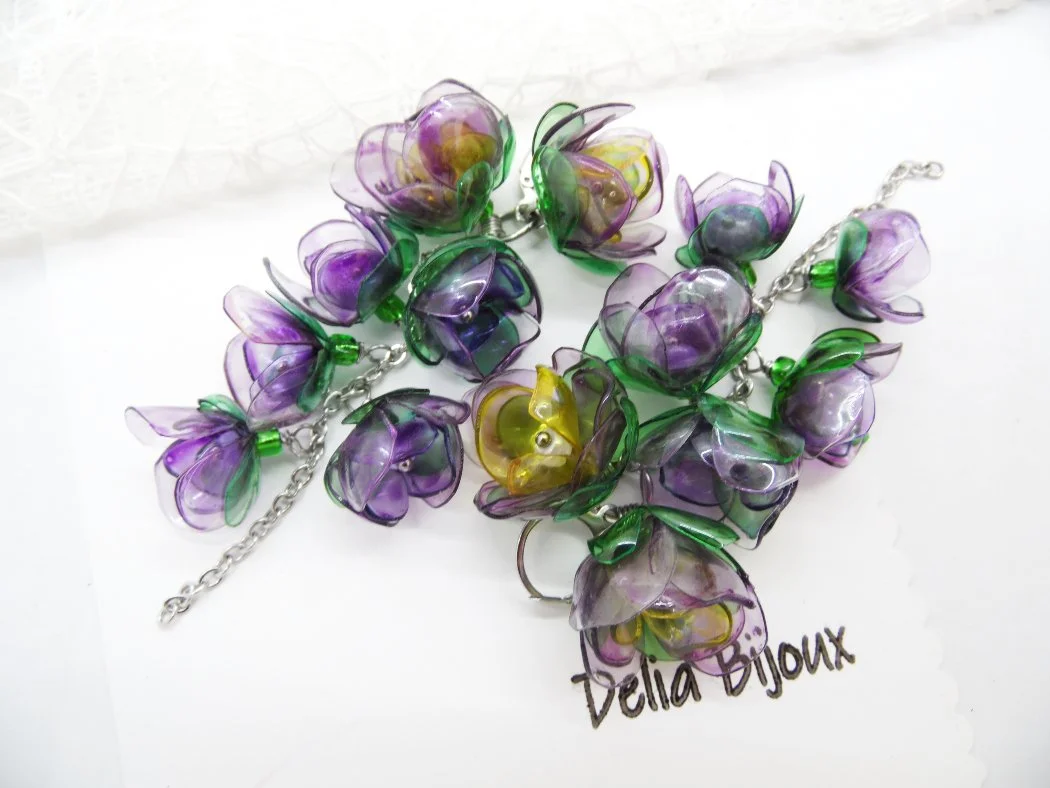 Ace?ti cercei spectaculo?i cu flori realizate din sticle de plastic reciclate sunt o alegere perfect? pentru iubitoarele de accesorii originale, sustenabile ?i u?oare. Fiecare floare este decupat? manual, modelat? la c?ldur? ?i pictat? ?n nuan?e de mov-lila, cu accente calde de galben ?n centrul florilor mai mari, oferind un efect artistic deosebit, cu un aer misterios ?i elegant. Frunzele verzi completeaz? compozi?ia, aduc?nd un aer proasp?t ?i natural.