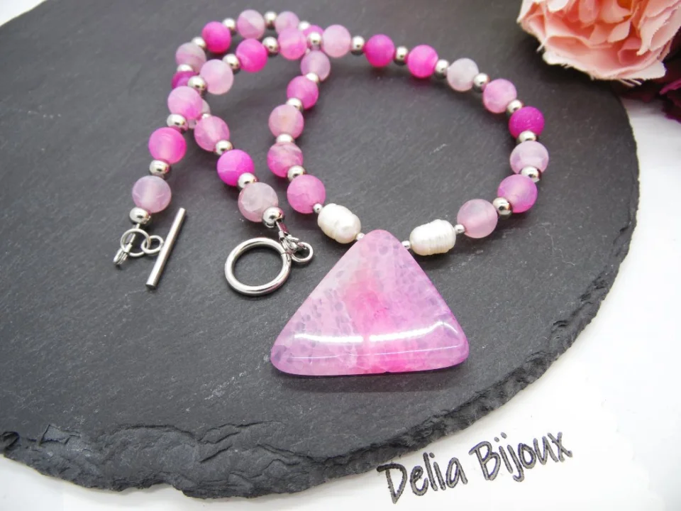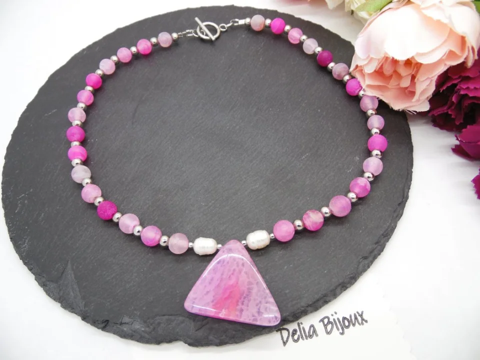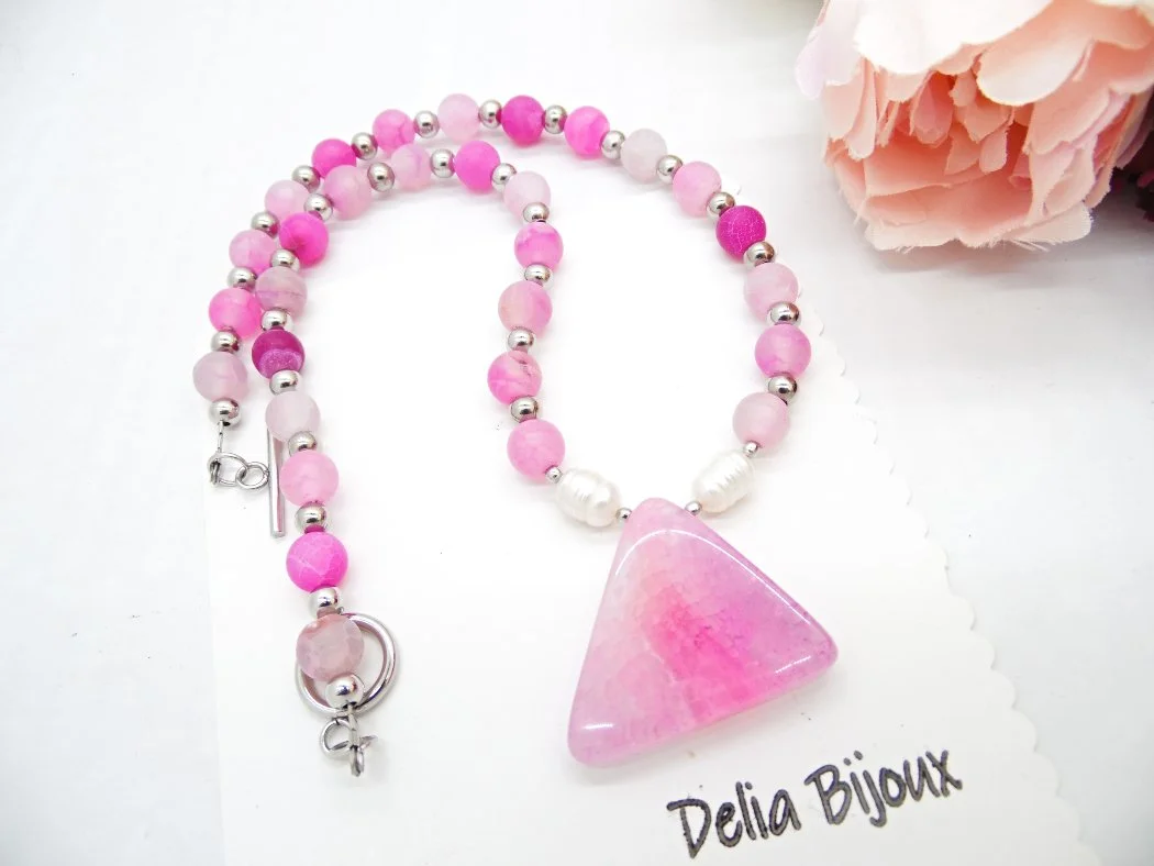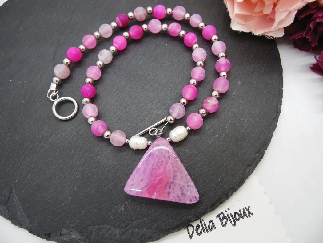 Adaug? un strop de rafinament ?i originalitate ?inutelor tale cu acest colier handmade, unicat, realizat manual cu grij? ?i aten?ie la detalii. Piesa central? este un medalion spectaculos din agat roz, ?lefuit ?n form? de triunghi, ce aduce un aer delicat ?i feminin. Medalionul este ?ncadrat armonios de dou? perle de cultur? albe, simboluri ale elegan?ei atemporale.