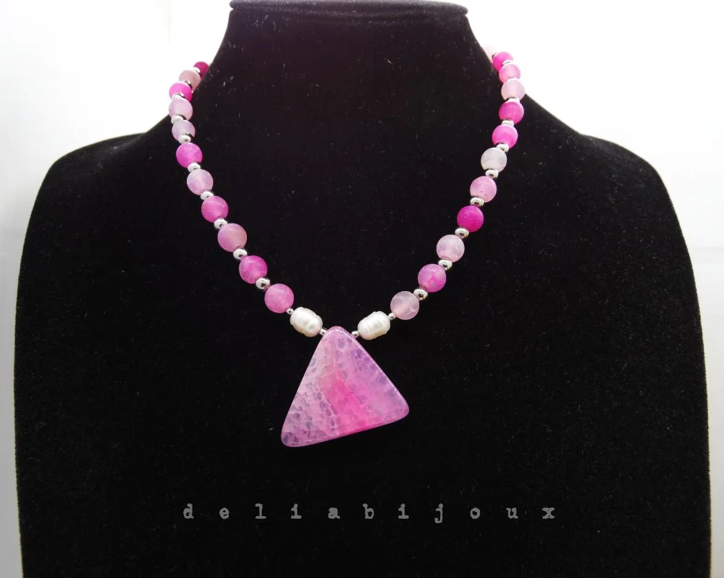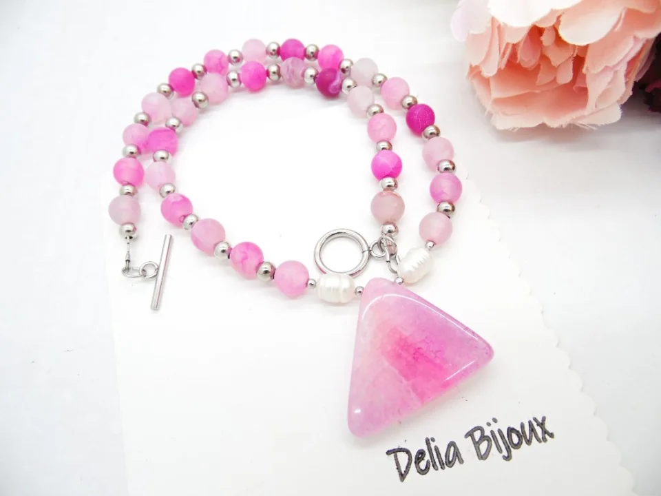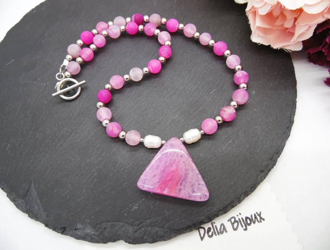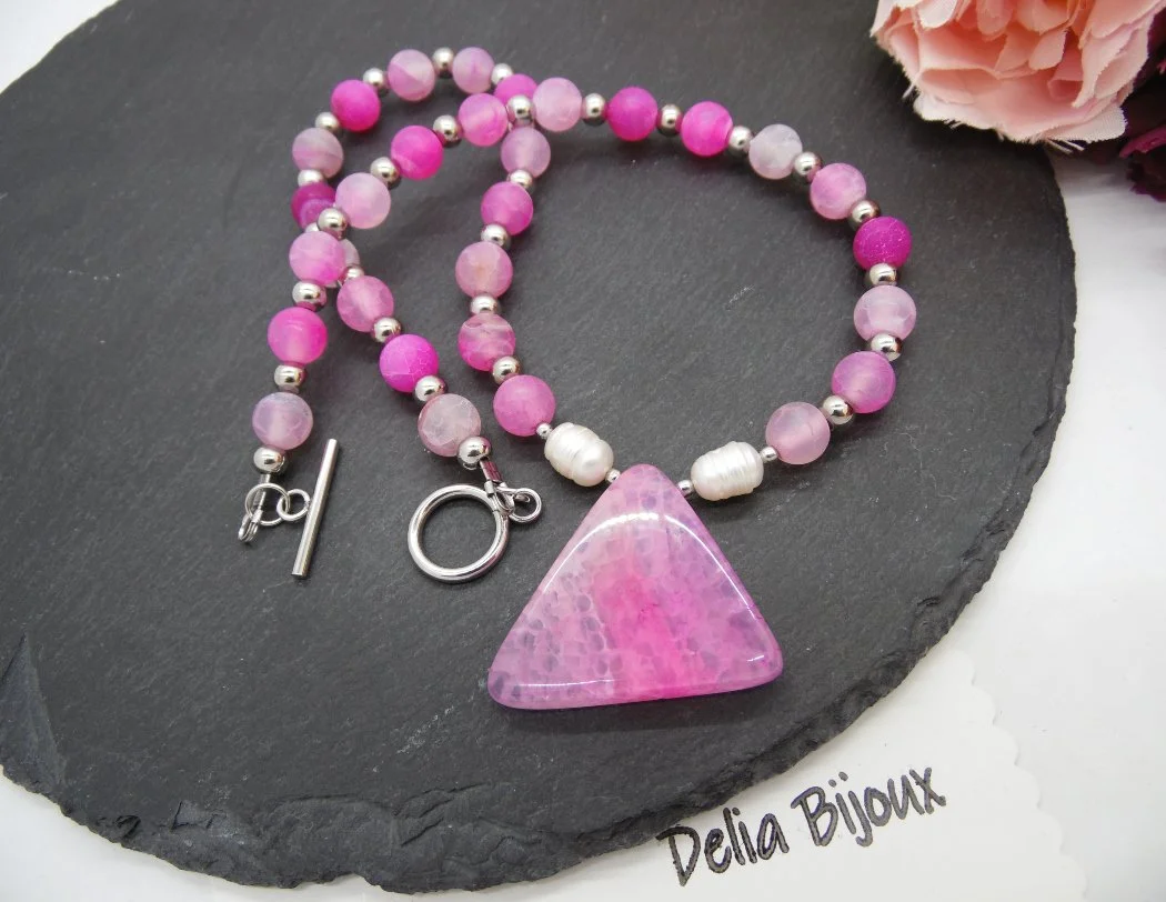 Adaug? un strop de rafinament ?i originalitate ?inutelor tale cu acest colier handmade, unicat, realizat manual cu grij? ?i aten?ie la detalii. Piesa central? este un medalion spectaculos din agat roz, ?lefuit ?n form? de triunghi, ce aduce un aer delicat ?i feminin. Medalionul este ?ncadrat armonios de dou? perle de cultur? albe, simboluri ale elegan?ei atemporale.