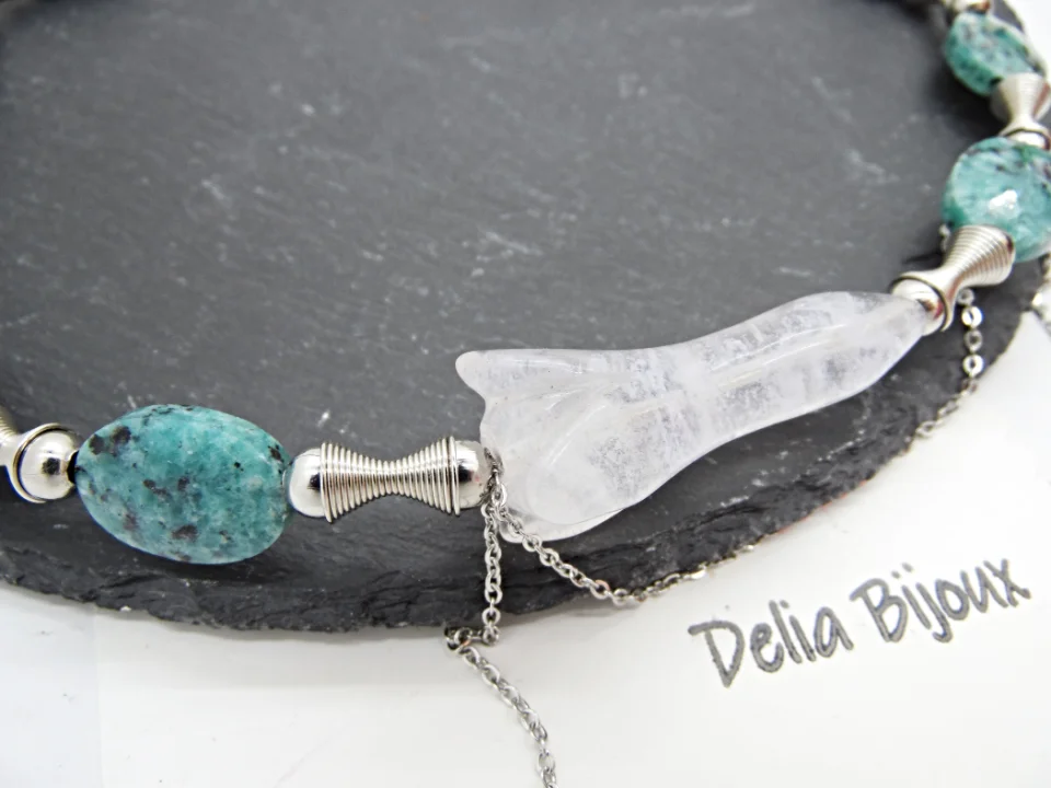 Colier handmade realizat din Blue Jasper fatetat ( 18 mm x 14 mm), cuart de stanca floare (42 mm x 18 mm -> prezinta mici imperfectiuni naturale), bile otel inoxidabil (6 mm, 5 mm, 4 mm), elemente metalice si lant din otel inoxidabil. Inchidere tip lobster din otel inoxidabil.