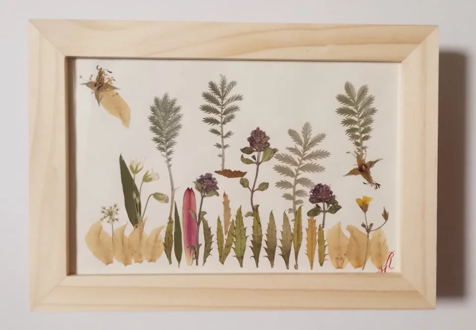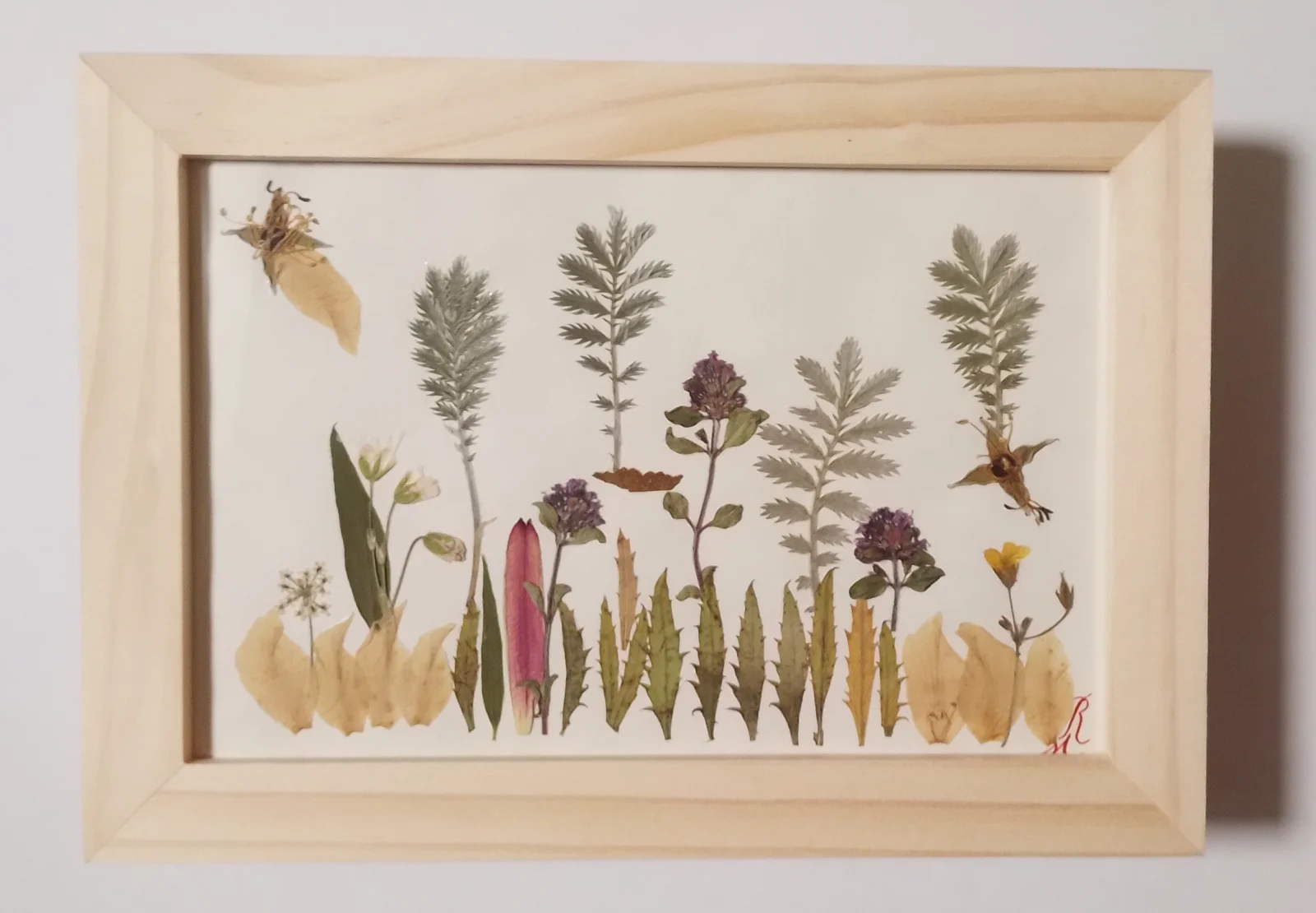 Compoziție cu plante presate din flora montană și arealul bucureștean: vetrice, plantă de cimbrișor, petale de iasomie, petale de gerbera, frunze de crăițe, plantă de măcriș.