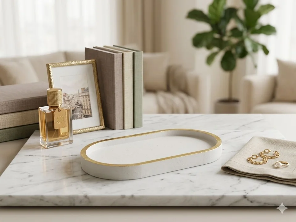 Tavita Minimalista Ovala: Elementul care unifica setul, ideala pentru organizarea accesoriilor sau ca suport decorativ protejat cu accente aurii pe margini.