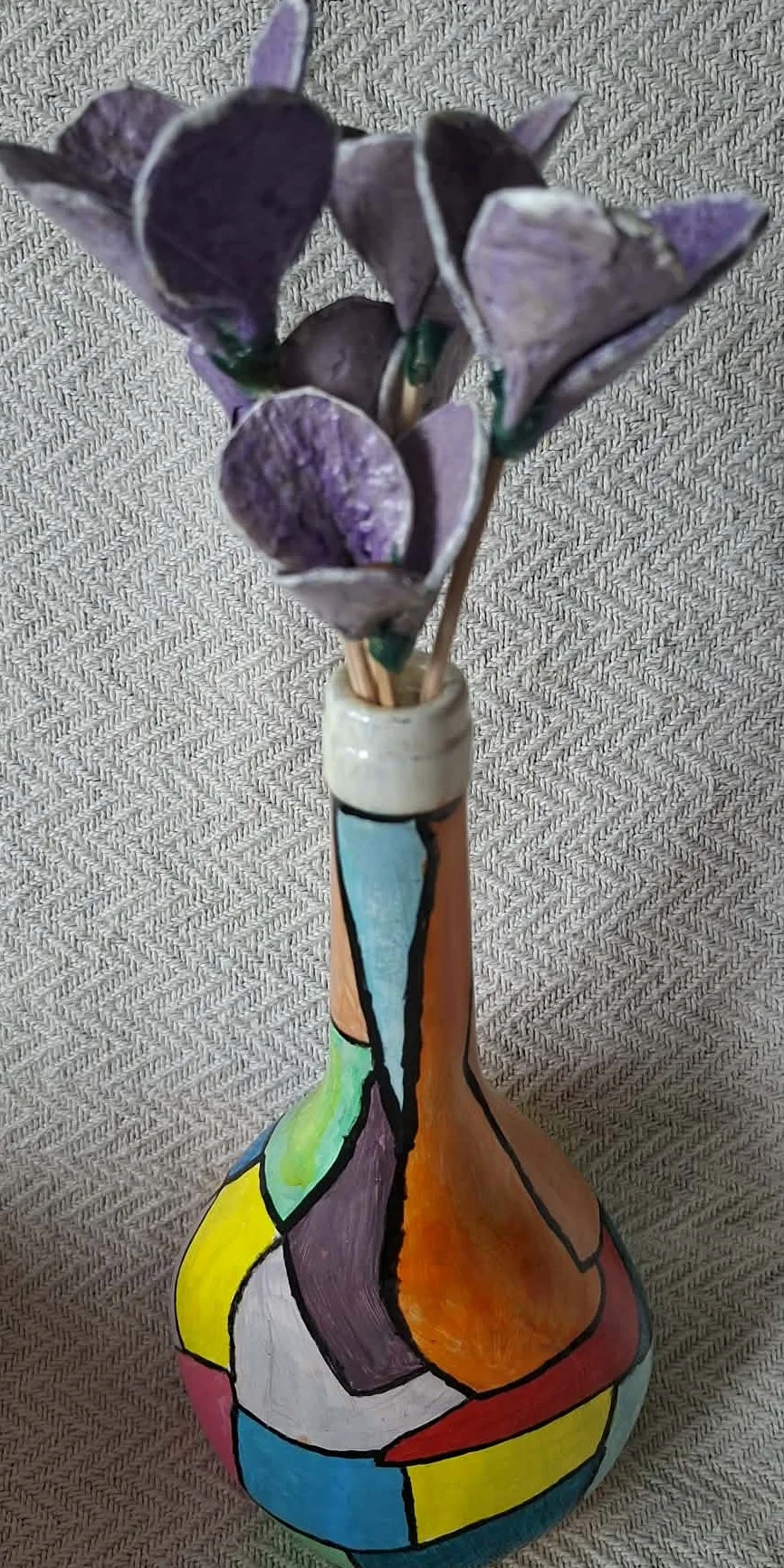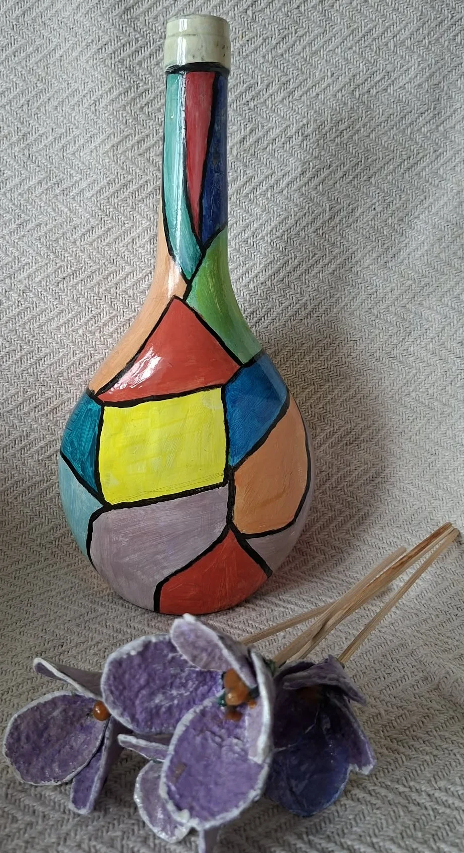 Sticla, pictata cu vopseli acrilice, cu branduse confectionate din papier mache.