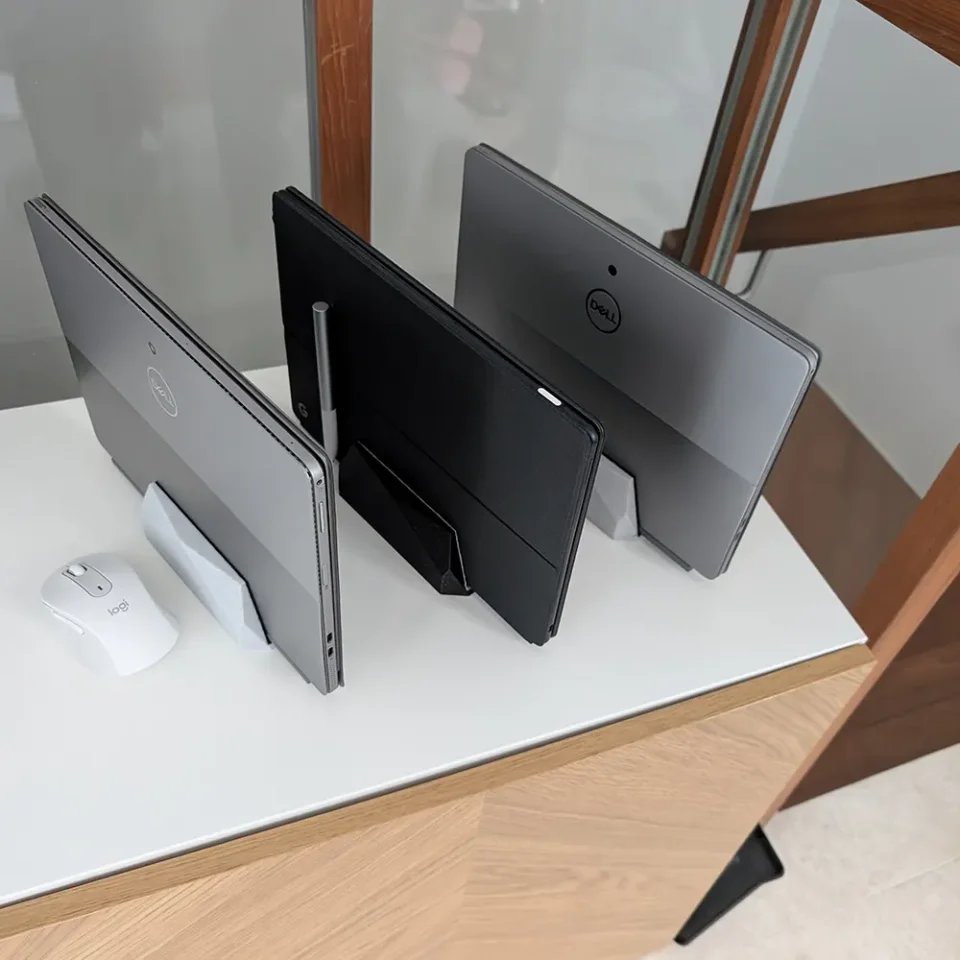 Dacă iubești un birou ordonat și minimalist, acest suport vertical pentru laptop este alegerea perfectă. Are un design geometric modern care îmbină funcționalitatea cu estetica, transformând spațiul tău de lucru într-un loc organizat și elegant.