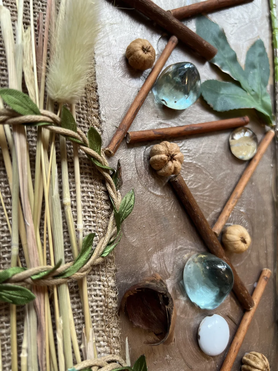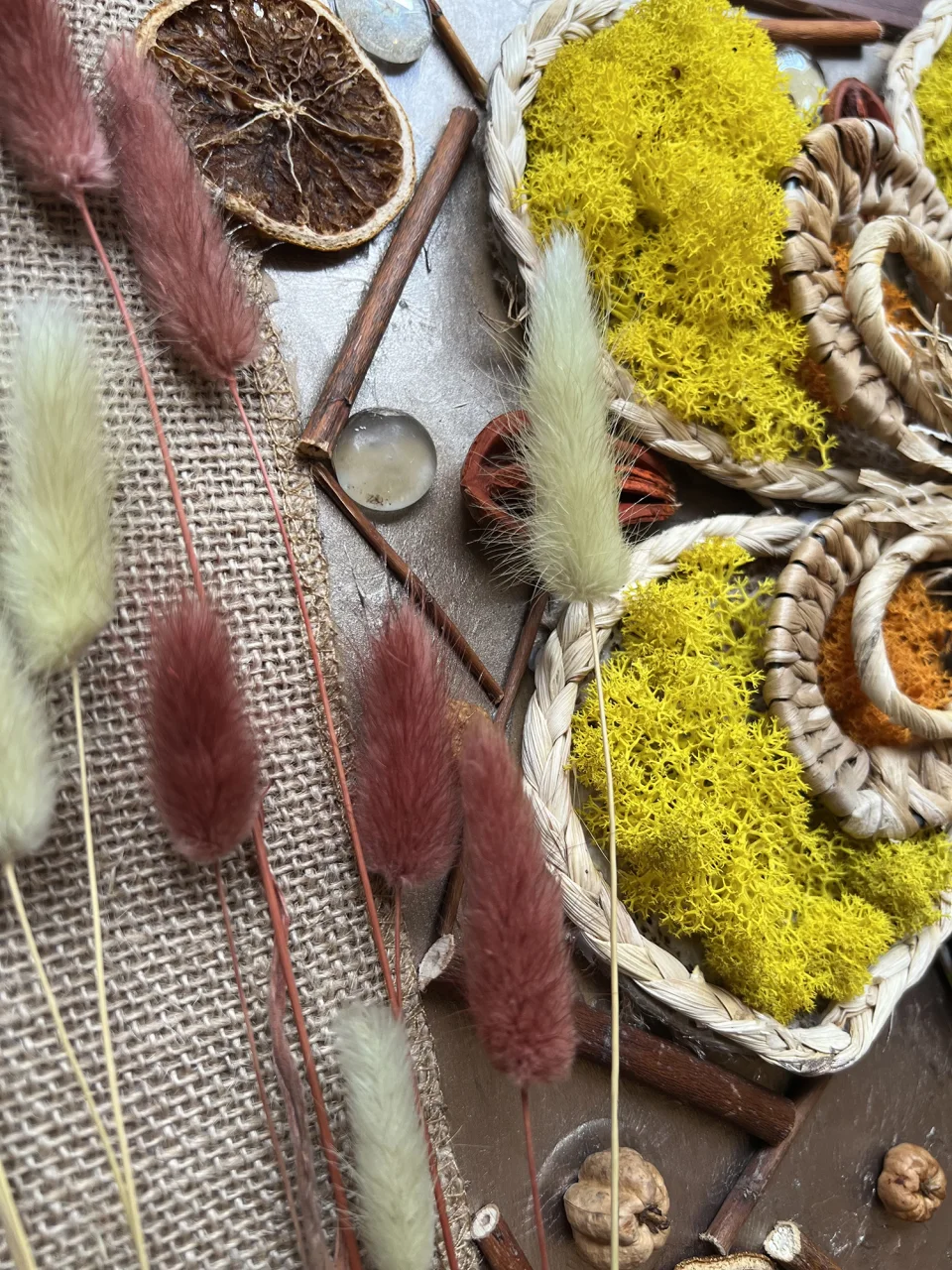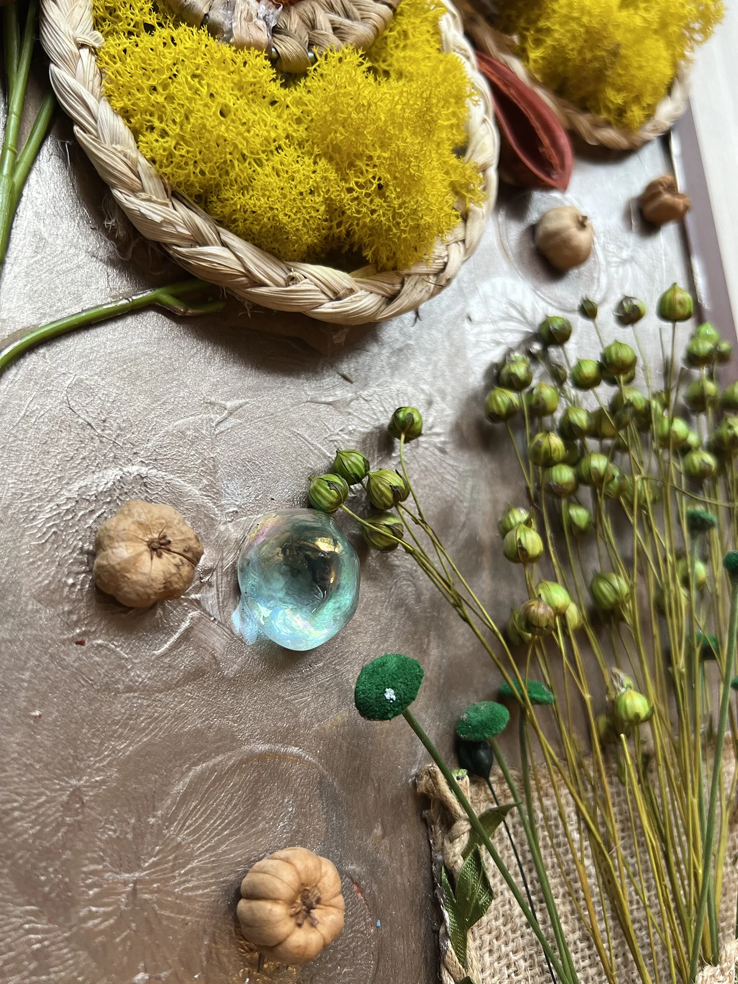 Tablou 3D cu licheni stabilizați și decorațiuni din lemn, pietricele, flori uscate, in și vopsea acrilică.