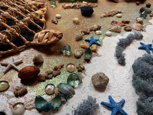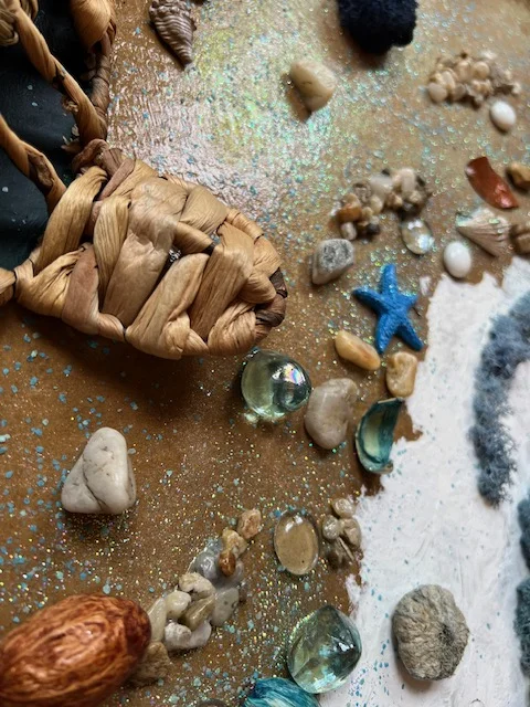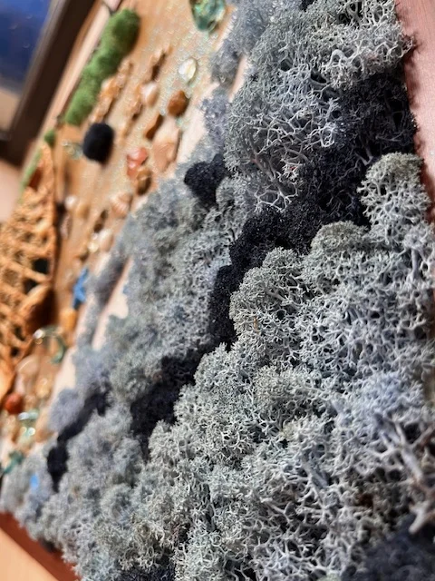 Tablou Unicat realizat din licheni stabilizati si decoratiuni 3D din lemn, pietricele, flori uscate si frunze.